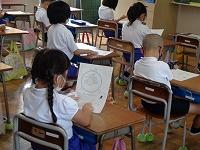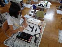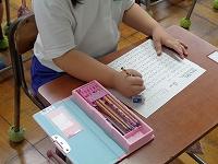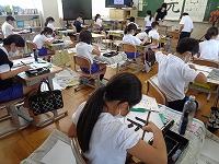 書写の時間。3年生から始まる毛筆に取り組んでいます。まだまだ毛筆の筆づかいに慣れていないのですが、慎重に筆を運びながら練習をしています。