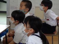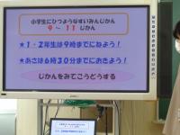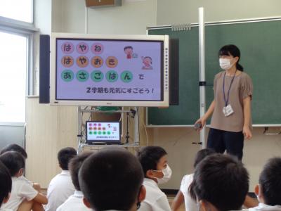 「はやね・はやおき・あさごはん」です。養護教諭から、どうして健康な体と心をつくるために「はやね・はやおき・あさごはん」が大切なのかを分かりやすく説明してもらいました。まだまだ、夏休みの名残で生活リズムが整っていない子も、今日からはバッチリ!自分でリズムを整えられるといいですね。お話のあとは、静かに自分の番が来るまで待ちながら、身体計測を行いました。