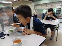たくさん歩いて、疲れ切った体。お昼ご飯は普段よりおいしく感じたはずです。メニューは牛丼。感染症対策のパーテーションが設置してある机で友達とほおばる牛丼には、お代わりする人も続出。