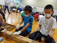 おいしい牛丼の後は、午後のプログラム「やき杉クラフト」一人一つの杉ブロックをもらい、一生懸命削ります。気に入った形になったら、バーナーで焼き色を付けてもらって完成。世界で一つの素敵なクラフト作品がお土産になりました。