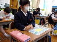 今日は、10年前に東日本大震災が発生した日でした。学校の職員玄関には、哀悼の意を表すための弔旗が掲がっています。そして、今日のお昼の放送は、南相馬市立小高(おだか)中学校の音楽の先生が作った合唱曲「群青」の紹介でした。その当時の生徒たちの言葉をつなげ、音楽の先生が1つの作品としてまとめた曲です。その歌詞を、今日の朗読担当の先生が紹介したあと、校内には、曲が流れました。歌詞の内容は言葉が難しい部分はあるけれど、1年生の教室をのぞいてみると静かに曲に合わせて体を揺らす子、テレビの画面をじっと見つめている子がいました。4年生の教室でも静かに画面を見つめています。