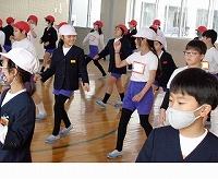 なんと、3年生から6年生へのサプライズ企画。担任同士で打合せがしてあったので、別れの言葉の練習で6年生が後ろを向いた瞬間を狙っての入場だったようです。軽快な音楽に乗って、3年生がダンスを披露してくれました。初めは、何が起こったのか分からず戸惑っていた6年生も、3年生の踊りの様子を見ようと、集まってきます。