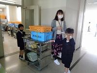 配膳室から、係の子が、ワゴン車を運んできます。みんなの給食をこぼしてしまっては大変とばかりに、慎重にそろりそろりと運んでいます。