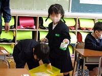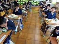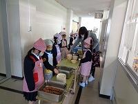 本校では、新型コロナウイルス感染症対策のため、教室の中が密になることを避けて、廊下で配膳をしています。