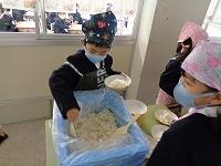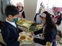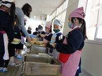 教室前の廊下に到着したら、盛り付けの準備です。係の子どもたちは、スムーズに盛り付けをするために、先生のアドバイスをしっかり聞いています。