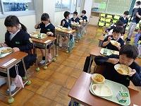 今日は、1年生の初めての給食の日。
