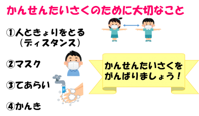 子ども達はテレビの画像を見ながら養護教諭の話を真剣に聞いていました。自分や家族を守るための大切なお話でしたので、指導の際に使用したスライド資料のうち、いくつかを紹介したいと思います。