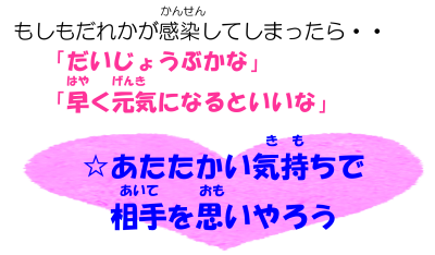 ご家族でも、くりかえし、何度でも、感染症対策について話し合ってみてください。また、どんなに予防対策しても、感染してしまうこともあります。その時には、もし感染したのが自分だったらという視点で、相手に温かい気持ちで対応することが大切ですね。