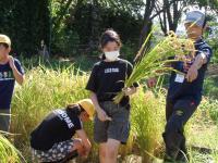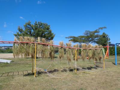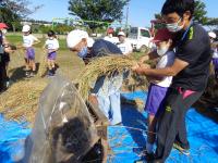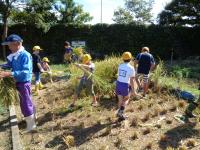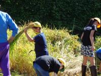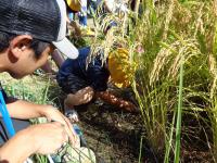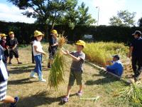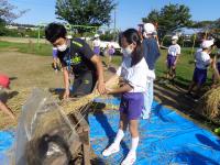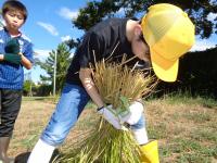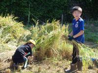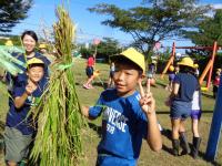 田んぼの中に足を進め、稲束を片手でぐっとにぎり、手にした鎌で稲を刈ります。初めての子もたくさんいましたが、みんな上手に作業していました。刈られた稲は、2束ずつクロスにしてからロープでしばり、雲梯にかけて天日干し。自然の力を借りてさらにおいしいお米に変身してもらいましょう。