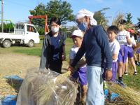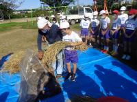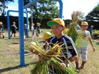 子どもたちは、その後、総合の時間を利用して観察を続けてきました。今日は、ついに稲刈りの日。西荒屋の川辺さんの力をお借りして体験活動をしました。