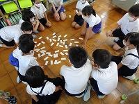 時には、楽しくて我を忘れて距離が近くなることもあります。神経衰弱をしているグループは、だんだん頭が真ん中によって来ていました。担当の先生が、「少し間をあけて広がってね」と指導をしていました。