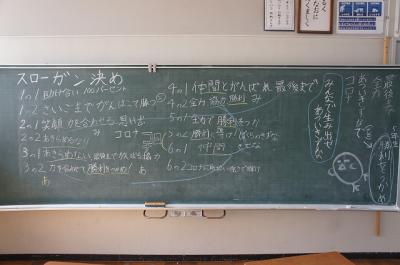 運動会に関して、応援団や団長も決まり、リレー選手も決まってきました。運動会に向けて学校全体が動き始めています。そんな中、各クラスからスローガンを募集し、集まったスローガンやクラスの運動会に向けた思いを受け、学校代表である委員長・団長・応援団を中心に話し合い、決定しました。
