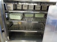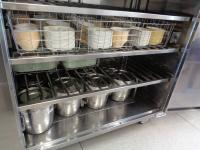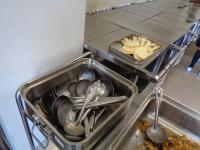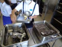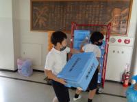 毎日の栄養たっぷりのおいしい給食。食べた後、各教室からおかずや主食が入っていたバットや食缶が1階の配膳室に集まってきます。12教室分が集まるわけですから、その量は大変なものです。バットや食缶だけでなく、お玉、トング、トレー、食器かごなども続々と集まります。学校から給食センターに戻すために、配送コンテナの中に効率よく詰め込まなくてはいけません。そこでは、給食委員会の高学年が大活躍してくれます。種類ごとに集めたり、物によっては重ねたりしながら作業していました。