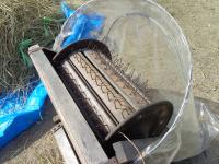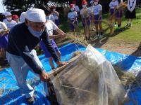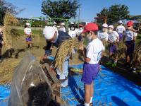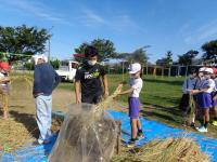 秋晴れの空の下、西荒屋の川辺さんのご指導のもと、先日収穫した稲の脱穀体験を行いました。昔ながらの足踏み脱穀機を使い、一人一人体験しました。はじめは、足踏み脱穀機に稲ごと吸い込まれそうになり、ひやりとする場面も見受けられましたが、そこはさすがに5年生。友達の作業の様子を見て、コツをつかみ、後半の児童は、とても上手に脱穀することができました。今年の学校田での収穫は上々のようで、例年以上のお米が収穫できたそうです。
