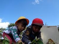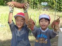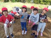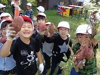小さな手で一生懸命土をほじり、時には土の中の虫に驚いたり、大きなお芋に出会えて歓声をあげたりしながら楽しく活動していました。形のきれいな立派なさつまいもが多く、子どもたちも満足げ。中には、かわいいミニさつまいもを集めて「かわいい」と喜んでいる子もいました。