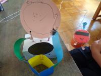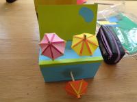 この写真は、製作途中なのですが、1時間後に見たときには、カラフルな風船がとんでいたり、バックが素敵な景色になっていました。雨が降ったときにうきうきして傘を上下に動かしているイメージでしょうか。