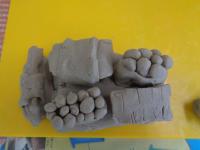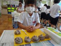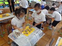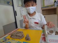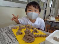 粘土でごちそうを作ったようです。教室をのぞいた時は、お客さんとお店屋さんになって、友達の作ったごちそうを見に行ってました。中には、もぐもぐと食べるまねごとをする子もいました。食べたくなるくらいおいしいごちそうだったのでしょうね。
