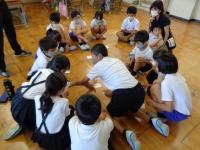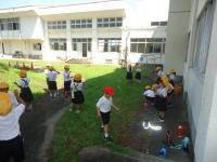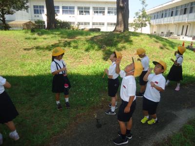 1年生が、校舎の影を利用して、生活科でシャボン玉遊びを楽しんでいました。大きなシャボン玉を作ることができて喜ぶ子。シャボン玉の虹色の光をふしぎそうに見ている子。友達と競争しながらシャボン玉を作っている子。思い思いに楽しさを見つけてシャボン玉遊びをしていました。一人でやっても楽しいシャボン玉。でも、大勢の友だちと一緒に活動すると、友達に自分のシャボン玉の大きさをほめられたり、遠くまで上がる様子を競い合ったりと楽しさも倍増ですね。楽しいことをしている間は、時間もあっという間。日陰ということもあり、暑さもあまり感じないようです。