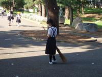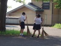 また、松葉清掃をする子どもたちの姿も見られました。日陰を上手に利用しながら、竹ぼうきでせっせと道に広がった松葉を集めています。
