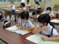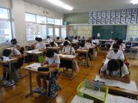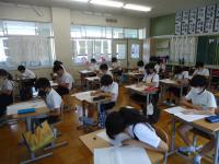 1組は、算数のテストをしていました。先生がテストの説明をしている間の子どもたちの姿勢の美しいこと!「数字はていねいに書きましょう」と先生がお話すると「はい」ときちんと返事をする1組さん。先生の「始めましょう」の声かけで、みんな真剣に取り組み始めてました。
