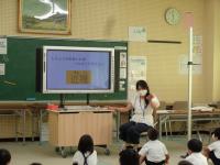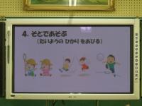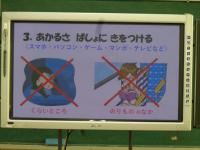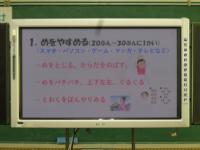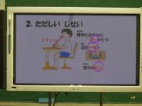身体測定の前に、養護教諭から「目を大切にすること」についての保健指導もありました。視力が落ちるのは、生活の様子と関係があること、自分で気を付ける4つの項目のことなどを大きな画面で資料を提示しながら分かりやすくお話してくださいました。