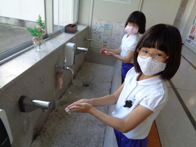 この1学期は、「コロナ」がキーワードの1学期でした。朝の検温チェックの様子はすっかりと定着しました。1時間ごとの15分休みでは、クラス別に手洗い行動をしています。この様子も定着してきたようです。何気なく休み時間に職員室を出ると、廊下には2年生の子が手洗いをしていました。