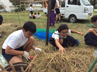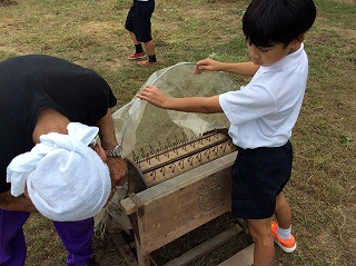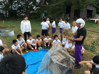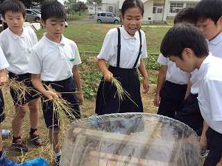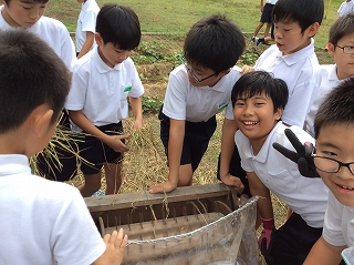 2019年10月2日 17時02分今日は、5年生が4月に植えた稲を収穫し、だっこくを行いました。
