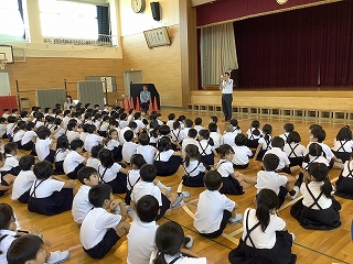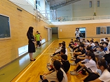 石川県警察本部、津端警察署のお巡りさんに来ていただいて、身の危険を感じるような場面でどのように行動すれば安全を確保できるかを学びました。