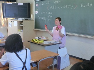 総合的な学習の時間に、職業について学習しています。何のために働くのかを考えることで、将来の夢や今の自分を考え直しています。本やパソコンで調べるだけでなく、その道のプロに来ていただいて直接話をきいたり技を見せていただいたりします。第1回のゲストは、保育士の前田侑紀先生(向陽台保育園)、第2回はパティシエの南谷晃平さん(リッチモント)に来ていただきました。園児の知らないところでの保育士の仕事や、忙しさに差がある働き方をしていることに驚いているようでした。