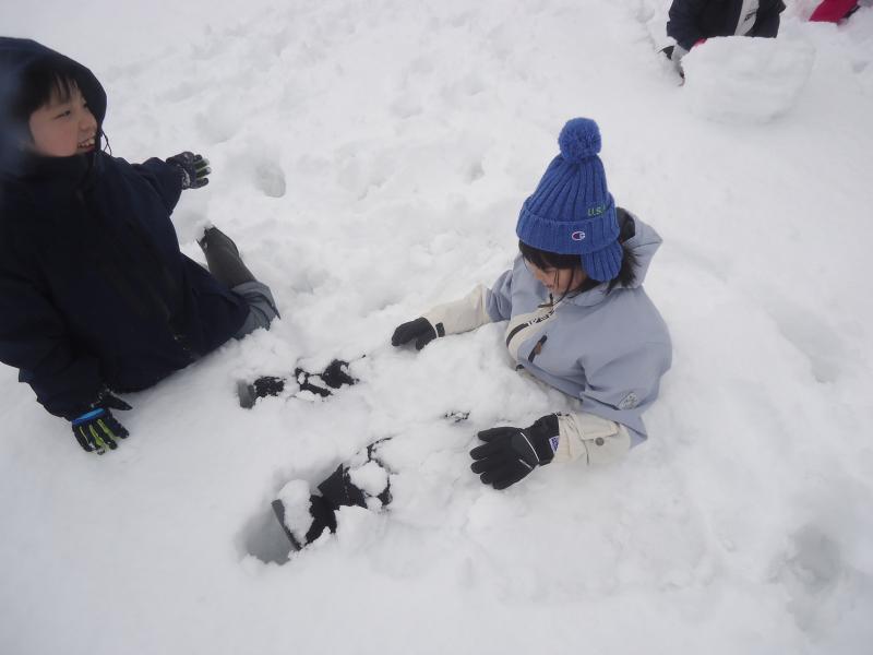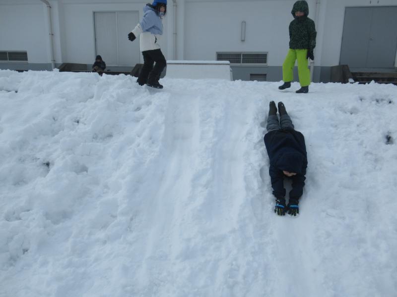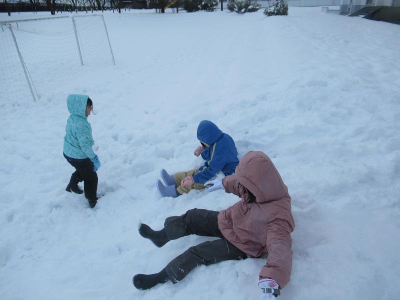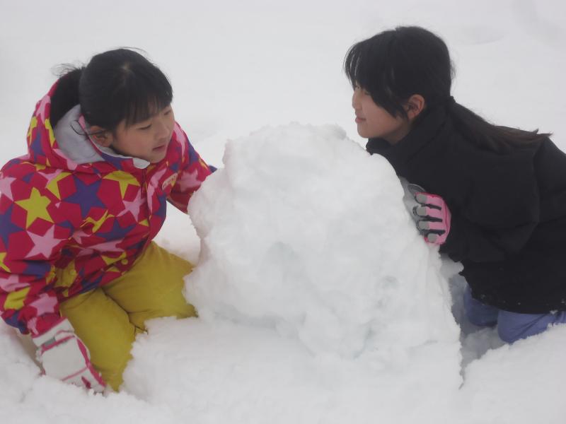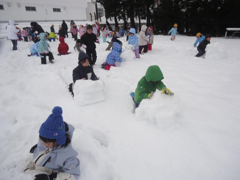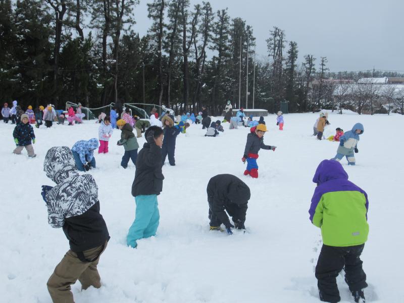 連日の雪で、学校にもたくさん雪が積もったので運動場に出て1,2年生みんなで雪遊びをしました。