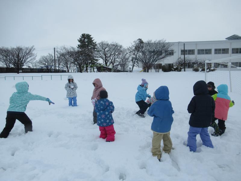 大きな雪だるまを作る子や雪合戦をする子、階段のところで雪の滑り台を楽しむ子など、みんなで思い思いの雪遊びを楽しみました。