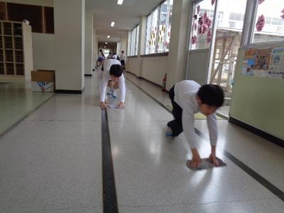 ①1年間お世話になった学校をピカピカに磨く子供たち