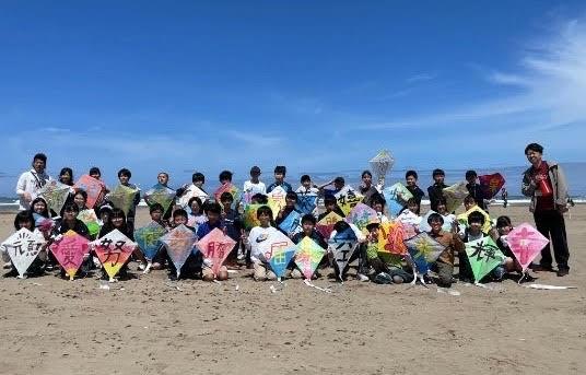 それぞれの思いをのせた凧が、連凧となり、内灘海岸の空に