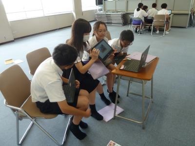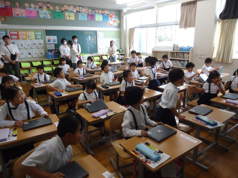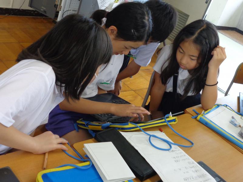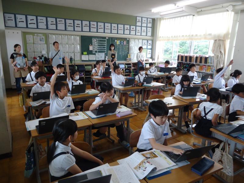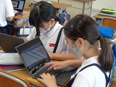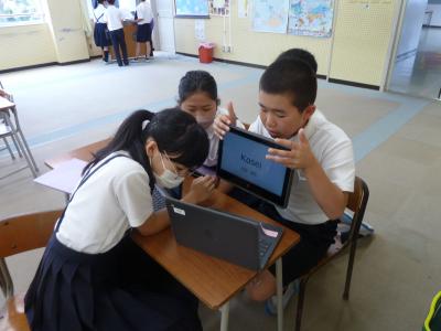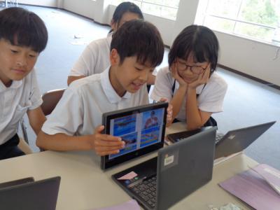 冷房の効いた教室では、キーボード入力の技を磨くために練習をしている子、授業の課題の続きを仕上げている子など、タブレットを使って過ごす姿が見られました。