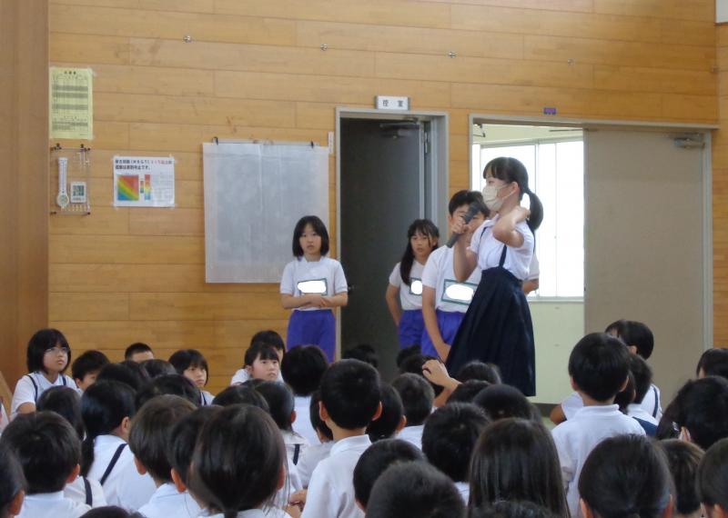 今月は、体育委員会と給食委員会が委員会発表をしてくれました。