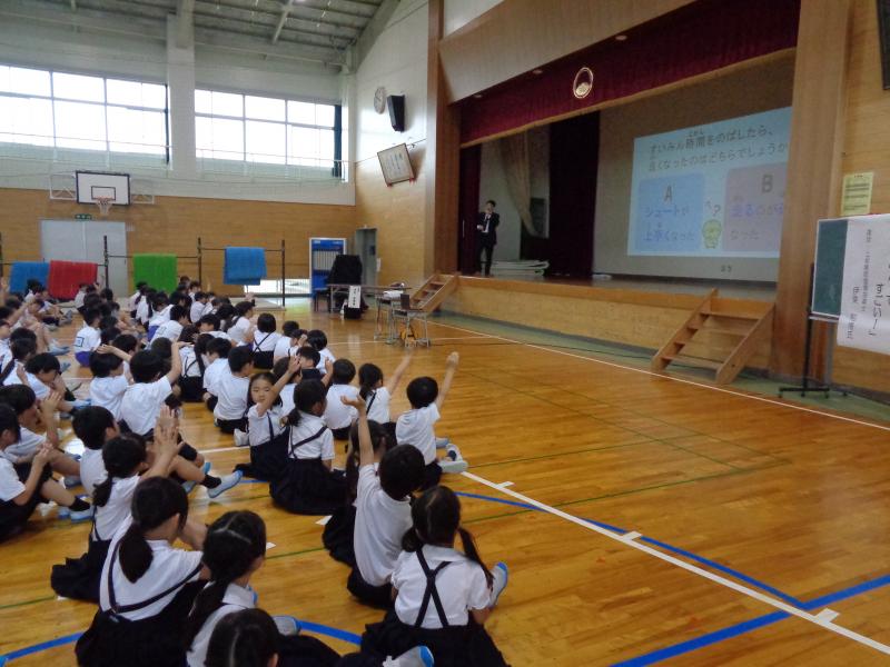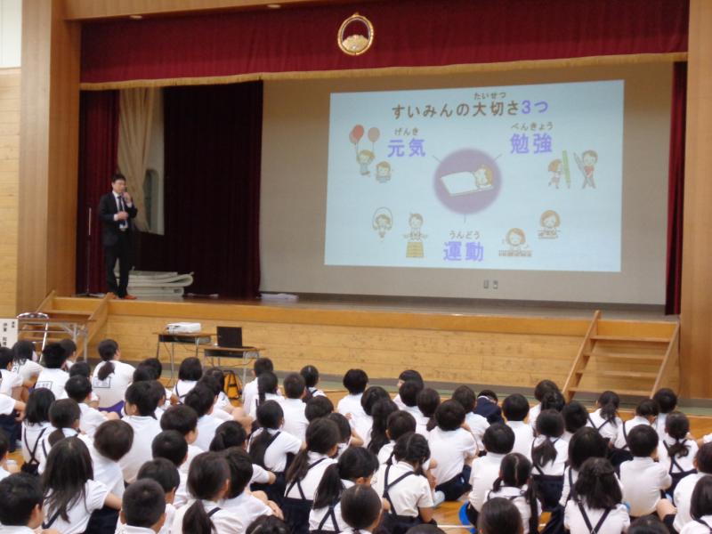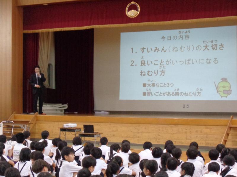 伊東先生から、睡眠が体と心の元気、勉強、運動に大きく関わっていることや、よいことがいっぱいになるねむり方をクイズやデータをまじえて楽しく教えていただきました。