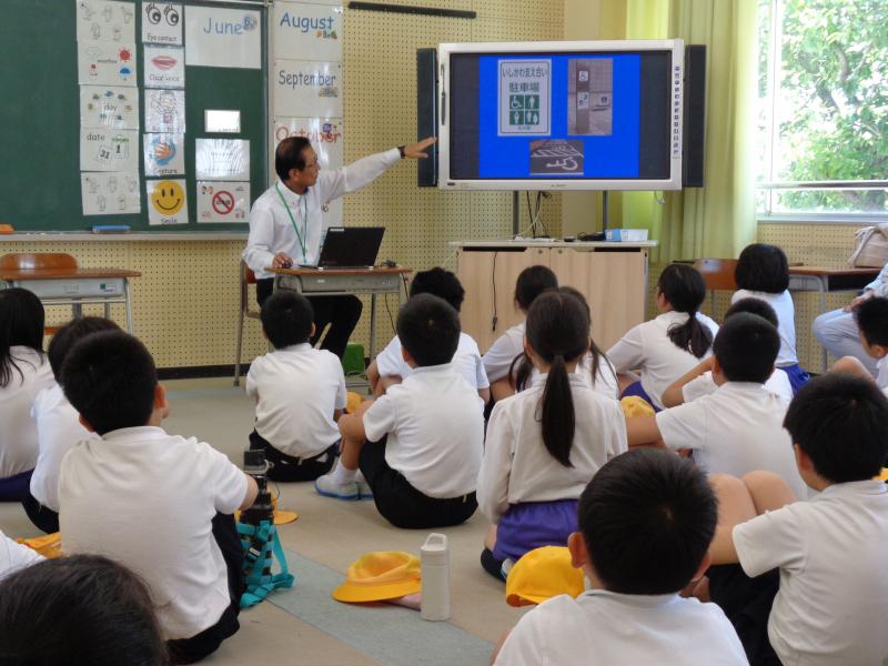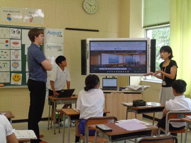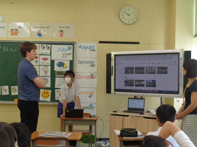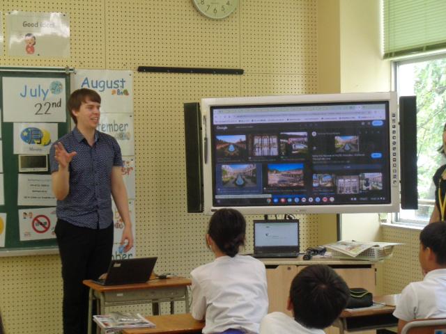 外国語の授業で、6年生が町国際交流員のジェイクさんとALTのリリー先生に楽しんだ場所について紹介しました。