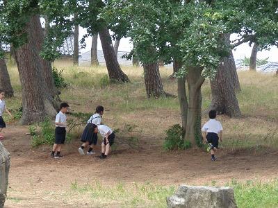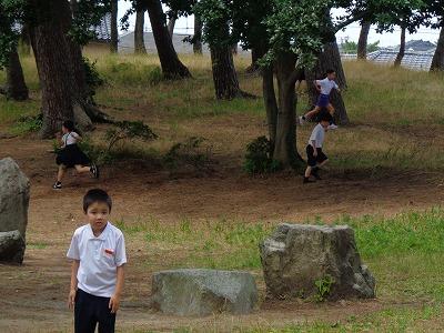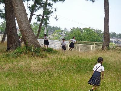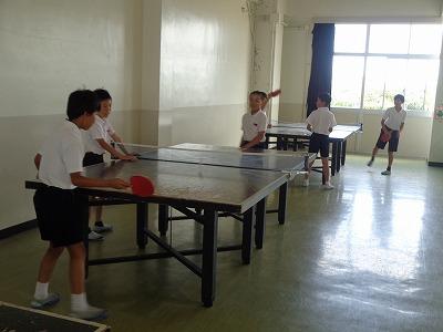 施錠してある玄関ドアの前には休み時間を外で過ごそうと並んで待つ子どもたち。鍵を開けると「開けてくれてありがとうございます。」と言いながら、元気いっぱいに外へと駆け出していきます。運動場へ向かう子もいますが、暑くなると人気の場所は「松林」。日陰になっているので、おにごっこをしたり、友達とおしゃべりしたりと思い思いの楽しみ方が見られます。体育館では、卓球コーナーで卓球を楽しむ高学年もいました。
