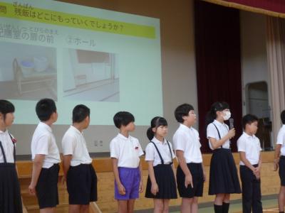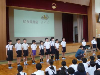 給食委員会は、クイズ形式で、給食の上手な片付け方をみんなに考えてもらいました。
