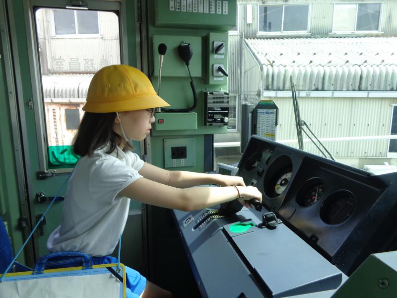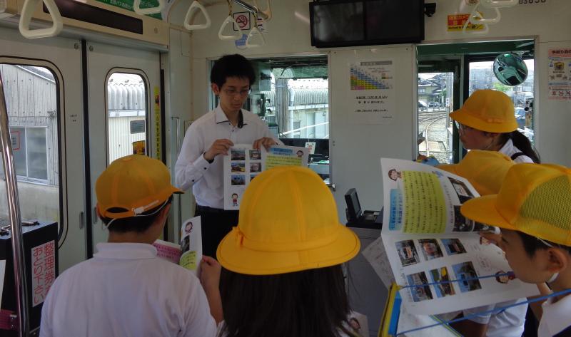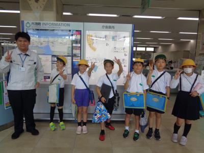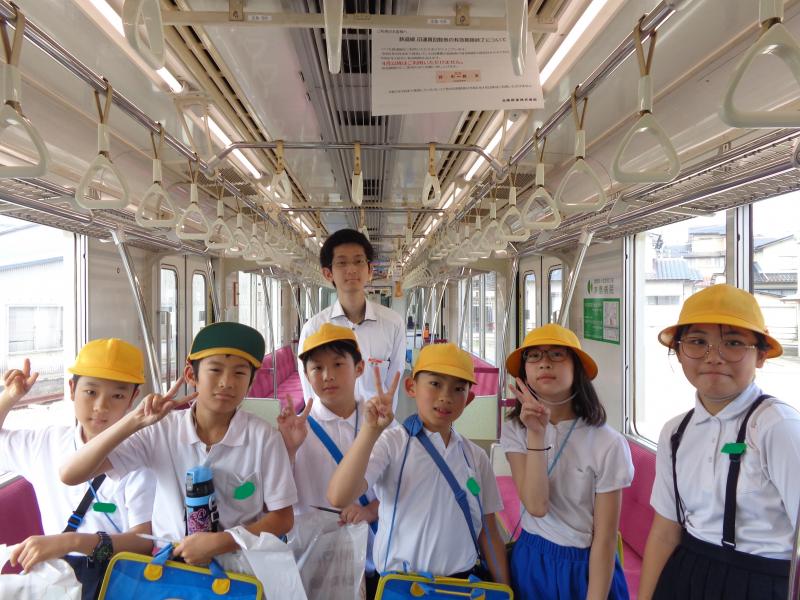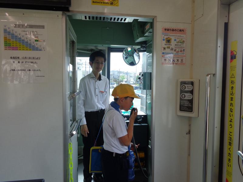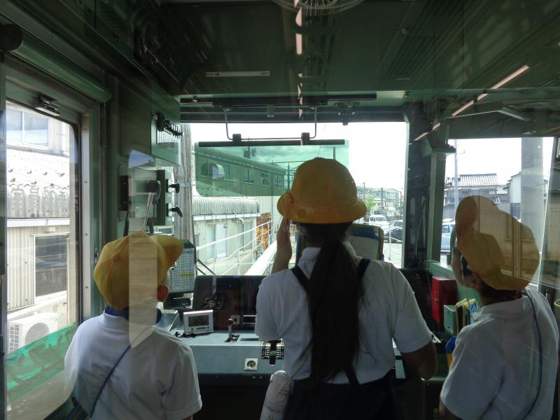 内灘駅では、鉄道部の宮田さんに取材してきました。駅のホームや電車内のバリアフリーを自分たちの目で確かめた後、誰もが利用しやすい内灘駅(電車)にするための工夫について、教えていただきました。また、実際に運転席に座ったり、アナウンスしたりするなど、普段はできない貴重な体験をさせていただきました。