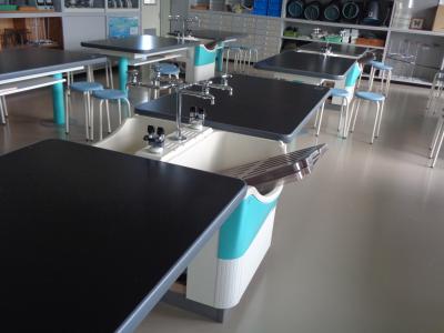 【理科室の貼りなおした床と新調した実験卓】
