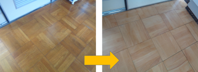 【磨かれて明るくなった教室の床(ビフォーアフター)】