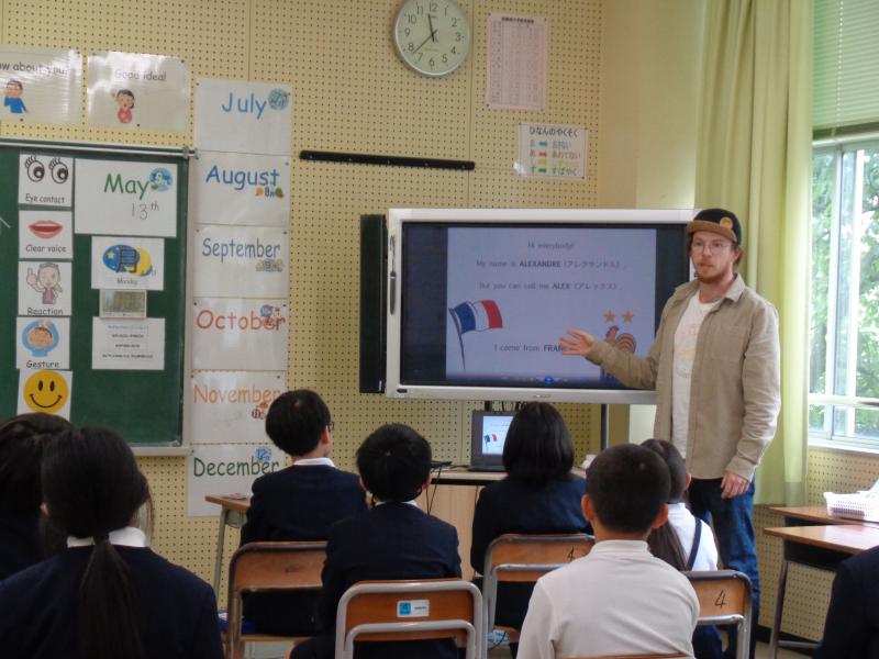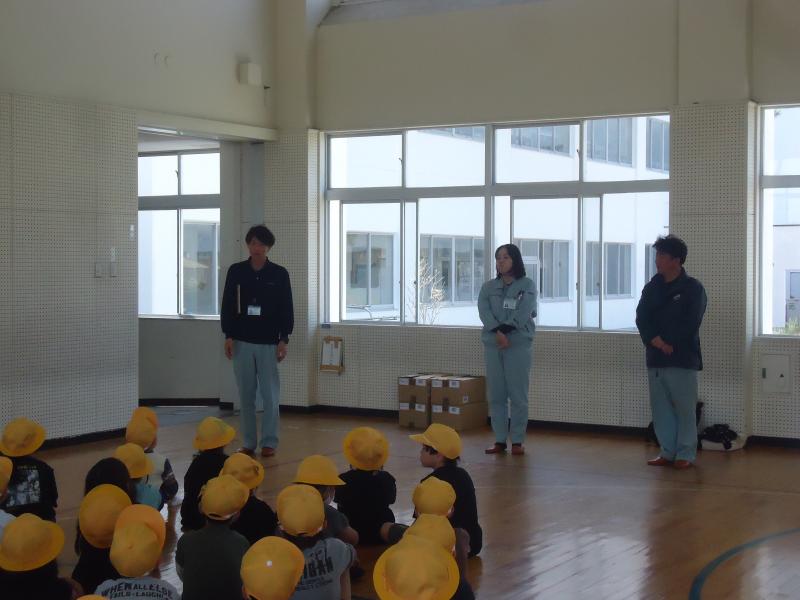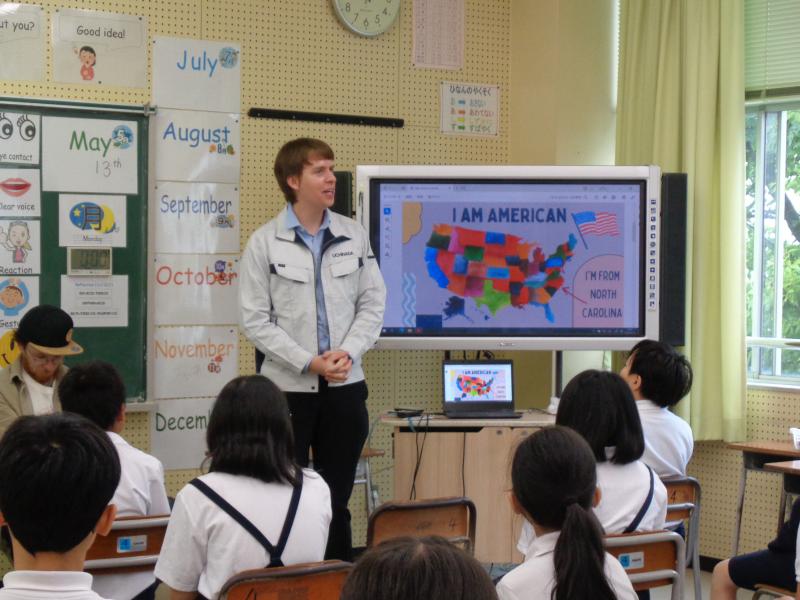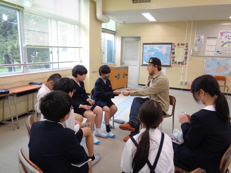 5年生の外国語では、自己紹介の学習をしています。学習のまとめとして、同じ校区に住んでおられるジェイクさん、アニーさん、アレックスさんの3名の方をお呼びして自己紹介をし合いました。