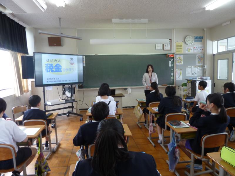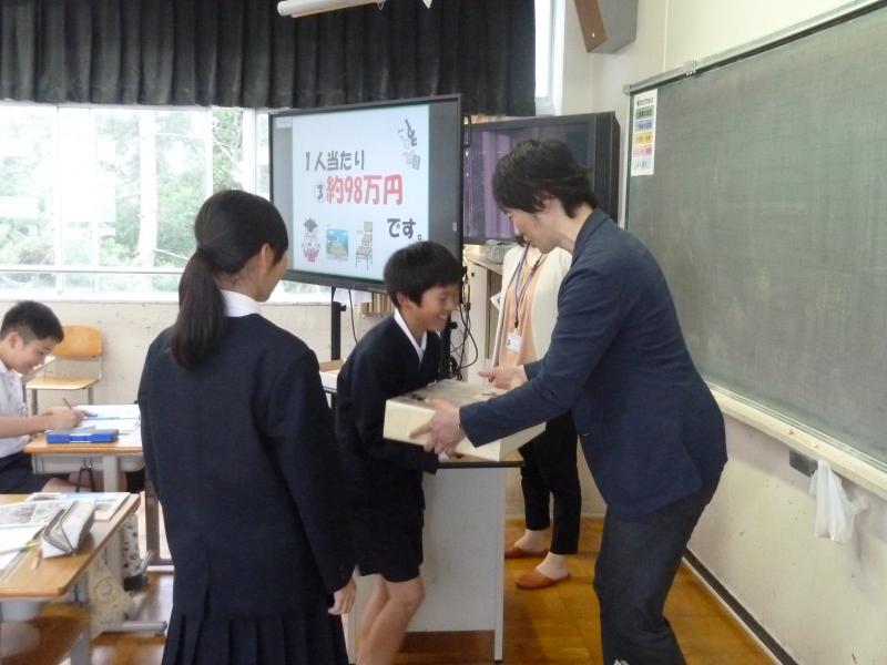 租税教室では、税金のしくみや使われ方について学習しました。1億円のレプリカを見せていただき、実際に持ってみると、すごく重たかったです。1年間に小学生1人に対して約98万円の税金が使われているのだそうです。税金の大切さを実感することができました。