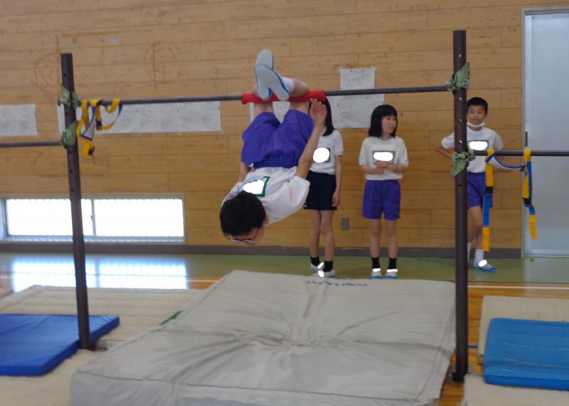 器械運動交歓会に向けてがんばっている4年生を応援したいと、5年生が、昼休みに4年生に鉄棒を教えていました。