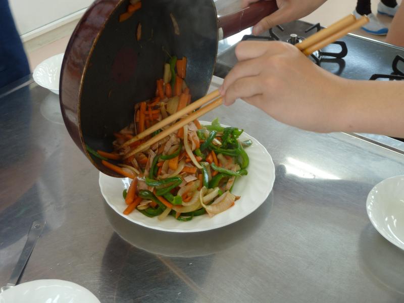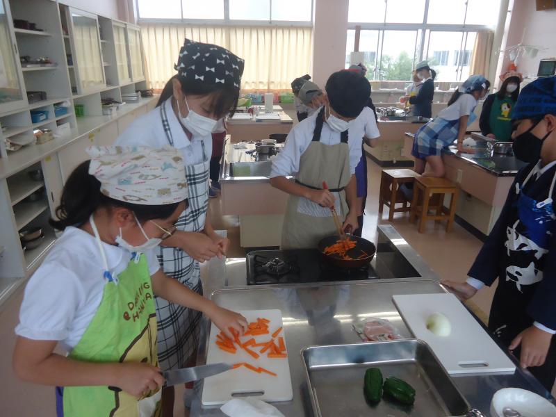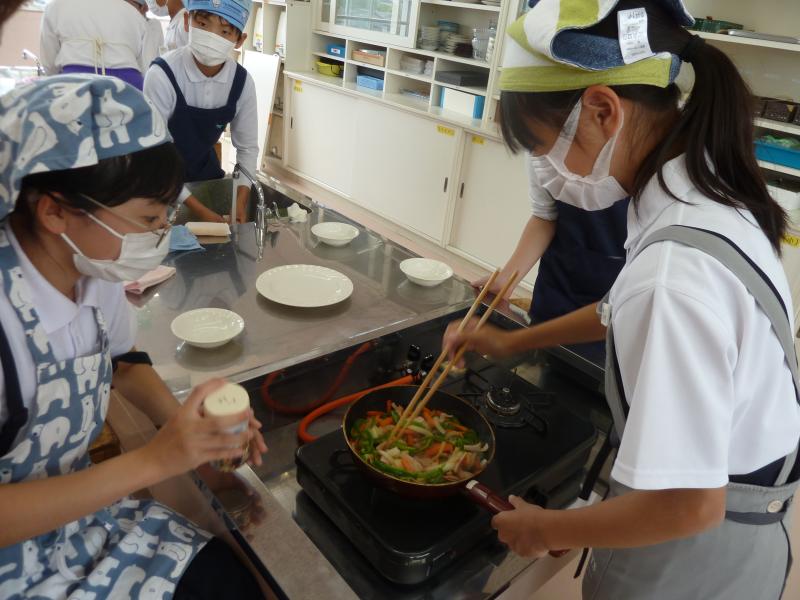 5月30日(木)に、6年生の調理実習がありました。今回は、にんじん、ピーマン、玉ねぎ、ハムを使って、「いろどりいため」を作りました。グループで役割分担をし、手際よく調理していました。さすが6年生ですね。野菜を炒めている間は、とてもいいにおいがしました。上手に出来上がり、おいしくいただきました。この学習の成果を発揮し、おうちでも一人で作ることができるといいですね。