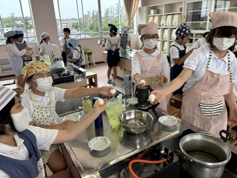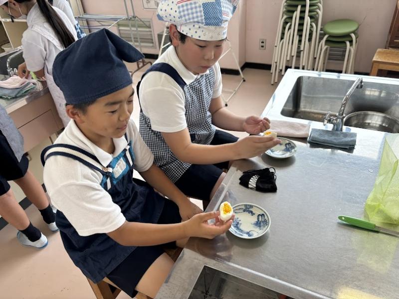 最初は不安そうでしたが、グループの仲間と協力して、おいしいゆでたまごをつくることができました!