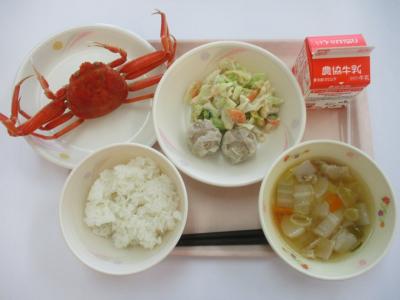 ~ごはん、ポークシュウマイ、(小6のみ)香箱ガニ、ツナサラダ、豚汁、牛乳~