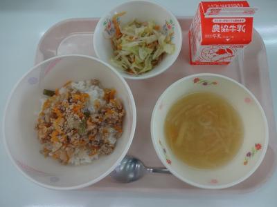 ~(麦飯)、そぼろ丼、野菜のナムル、みそ汁、牛乳~
