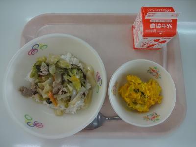 ~(麦飯)、中華飯、かぼちゃサラダ、牛乳~